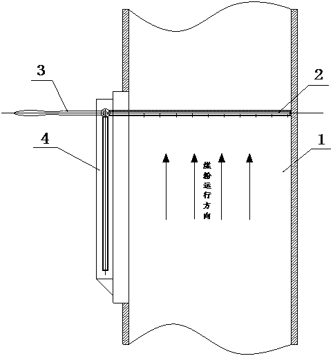 1、煤粉管道 2、取样时的取样管 3、取样操作杆 4、隐藏时的取样管